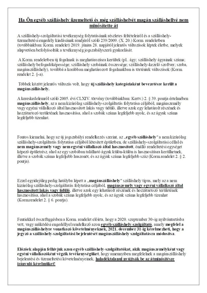 Információk szálláshely üzemeltetőknek, egyéb szálláshely átminősíttetéséről magán szálláshellyé.